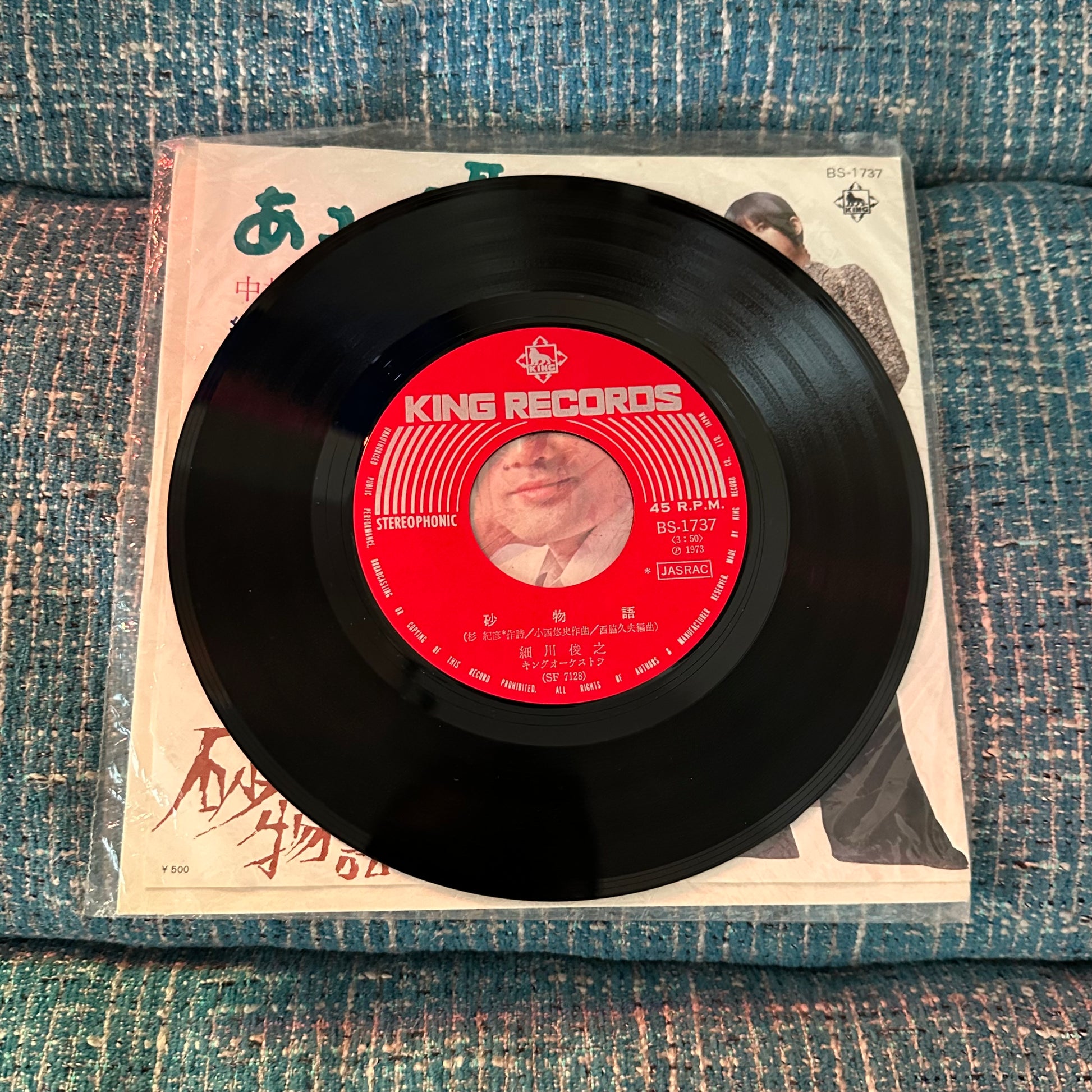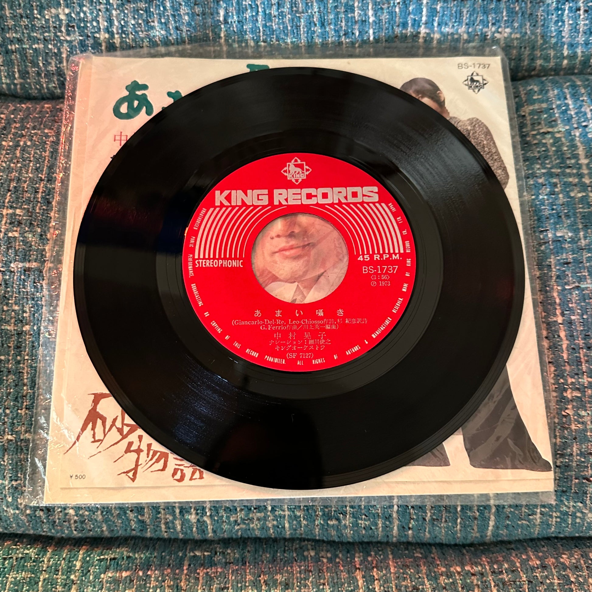 This is a charming mid 70s Japanese duet single with actress-singer Akiko Nakamura (中村晃子) with actor-vocalist Toshiyuki Hosokawa (細川俊之). The A side Amai Kuchibue (あまい囁き “Sweet Whispers”) is a smooth and lightly orchestrated pop duet typical of the era’s romantic television soundtracks, and Sendai Monogatari (仙台物語) on the B side carries Hosokawa’s solo delivery in a mellow tone.