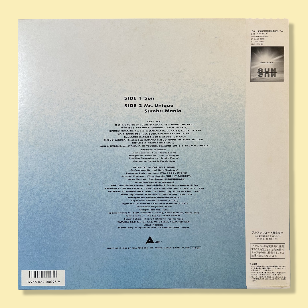 Issued in 1986 by Alfa Records, Sun is a late era Casiopea single that brought in producer and guitarist Carlos Alomar (David Bowie, Iggy Pop) for a New York recorded fusion session. The result is a bright, polished snapshot of Casiopea’s evolving mid 1980s sound, which bridges Japanese precision with stateside studio muscle. Includes Sun, Mr. Unique, and Samba Mania. Features full insert with lyrics in English and Japanese, photo print, and original obi strip.