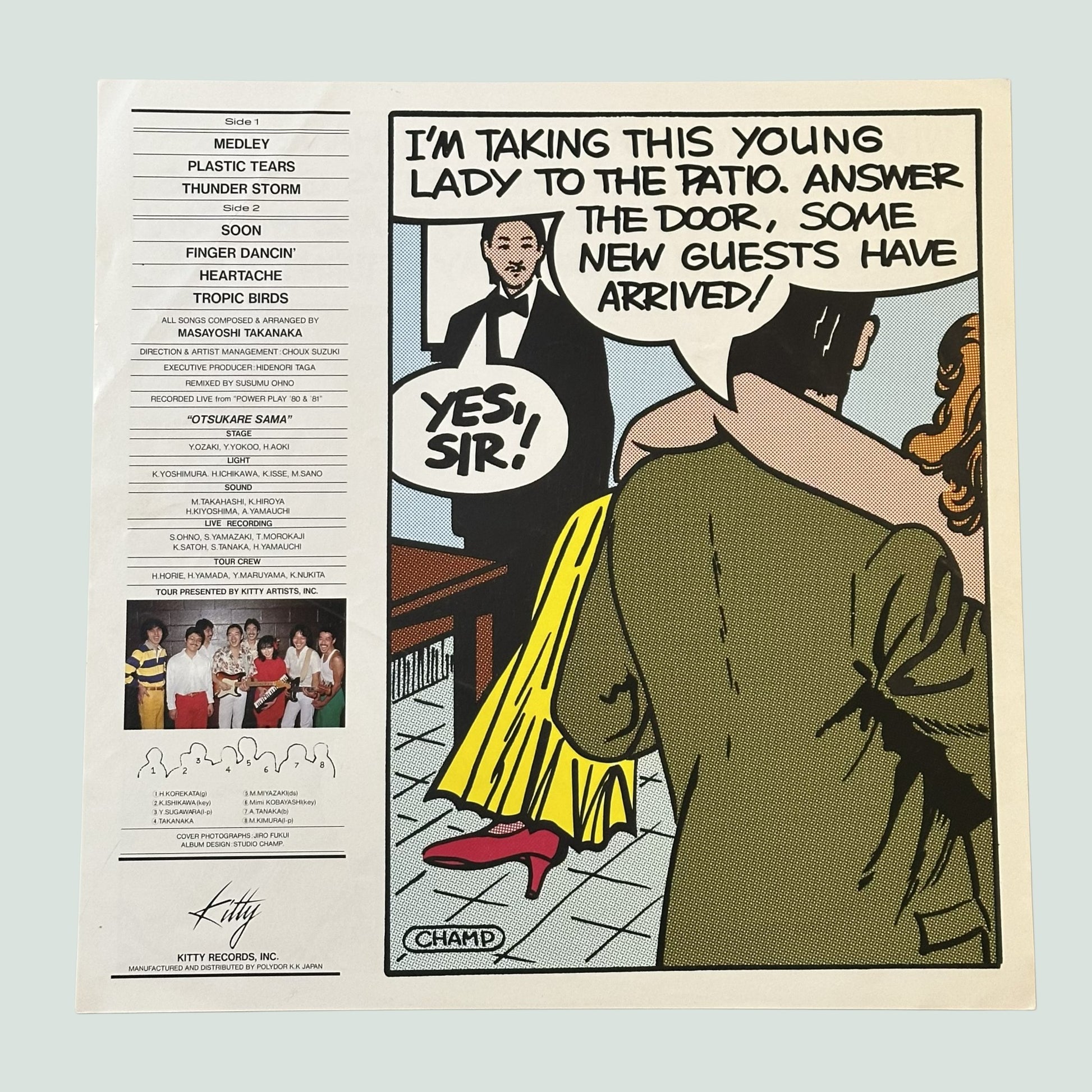 The inner sleeve’s comic panel art, credited to CHAMP, underlines Takanaka’s sense of humor and branding instincts, which turns an instrumental album into a piece of visual pop commentary. Original 1979 Kitty Records pressing (25MS-0007). A clean example of Takanaka’s early attempt to fuse technical precision with pop accessibility.